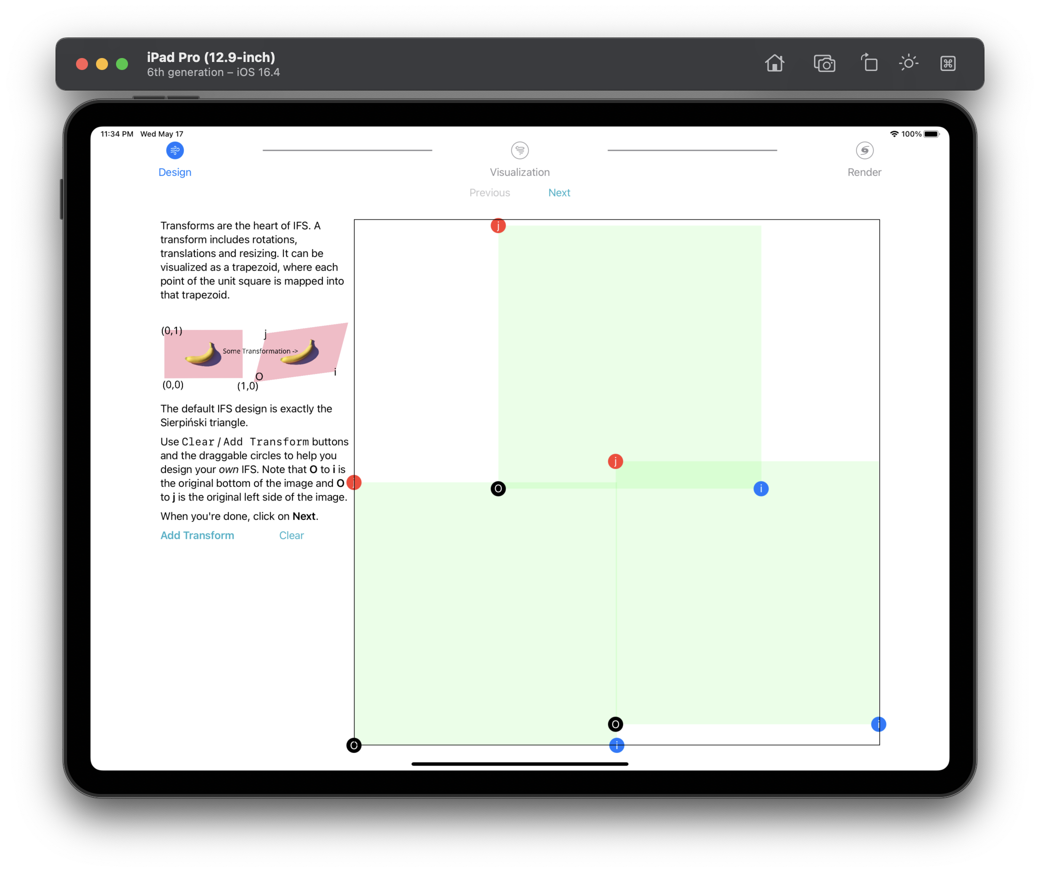 … in actually 3 lines of code (Thanks to CoreGraphics or I’ll have to add 10 more lines). Now the only thing left is to make it interactive and intuitive. The key part is to visualize the transforms $f$. Since we know it’s an affine transformation, which can be decomposed into a linear transformation and a translation. We can represent it using a parallelogram where one point represents the translation and the other two points represent the linear transformation. That is, for transformation: