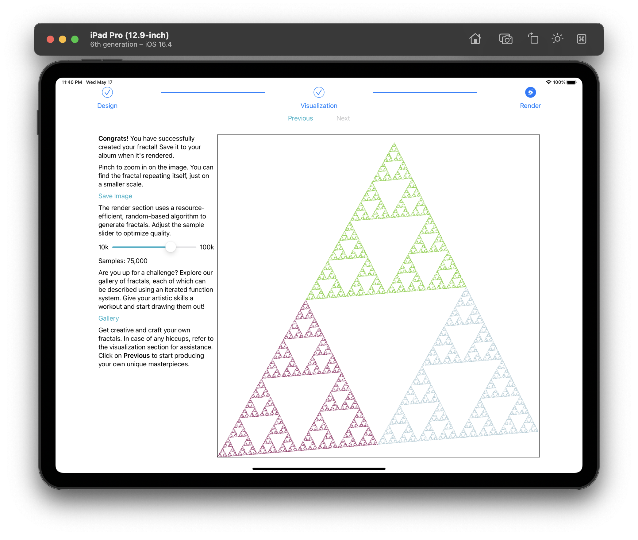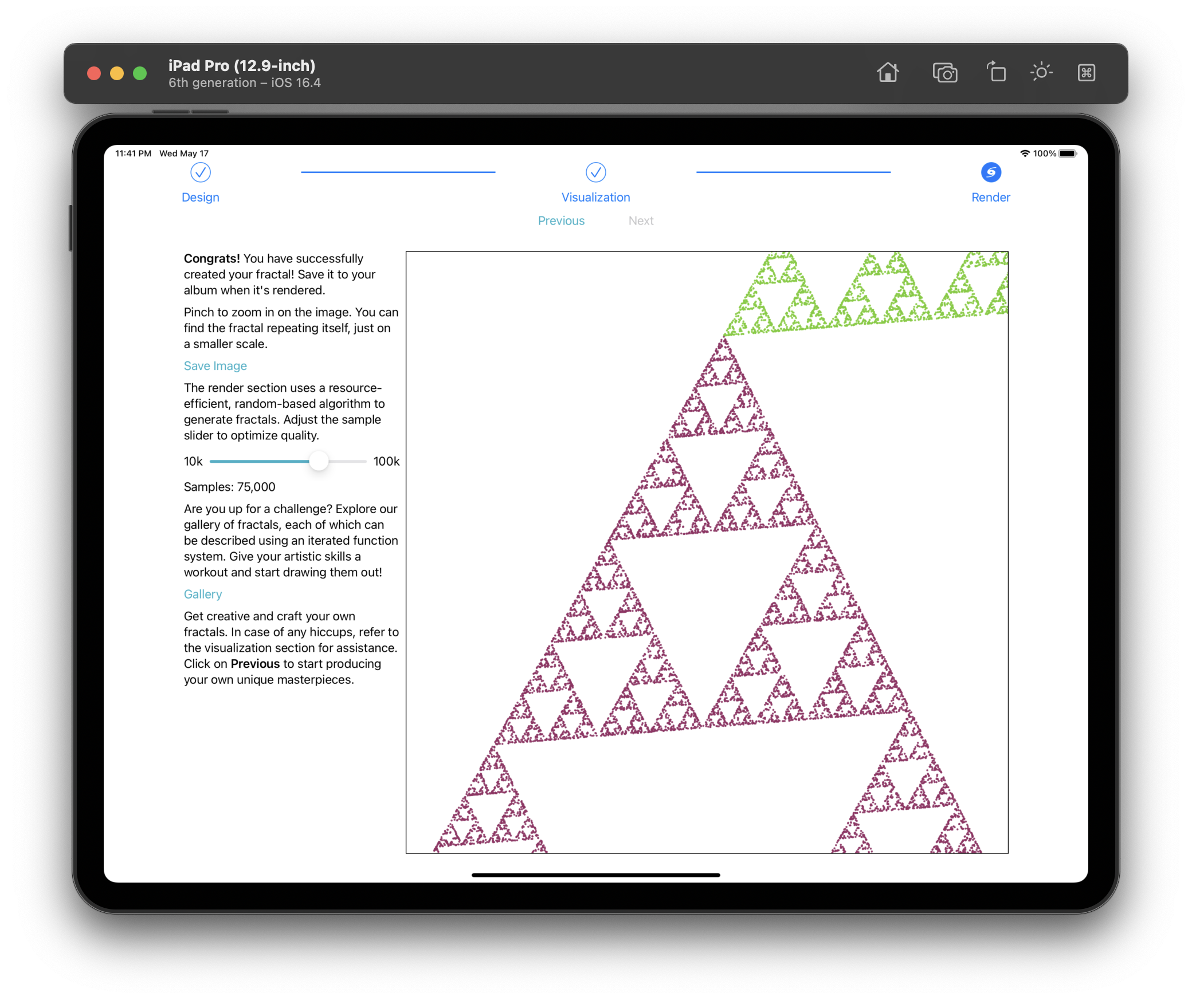 \[\begin{align*} & f_1(x,y) = (\frac{x}{2}, \frac{y}{2}) \\ & f_2(x,y) = (\frac{x}{2} + \frac{1}{2}, \frac{y}{2}) \\ & f_3(x,y) = (\frac{x}{2} + \frac{1}{4}, \frac{y}{2} + \frac{\sqrt{3}}{4}) \end{align*}\]More examples can be found here. Thanks to the chaos game algorithm, the IFS can be easily plotted by keep choosing a random function from the set and apply it to the current point. The barebone of the app is thus finished…