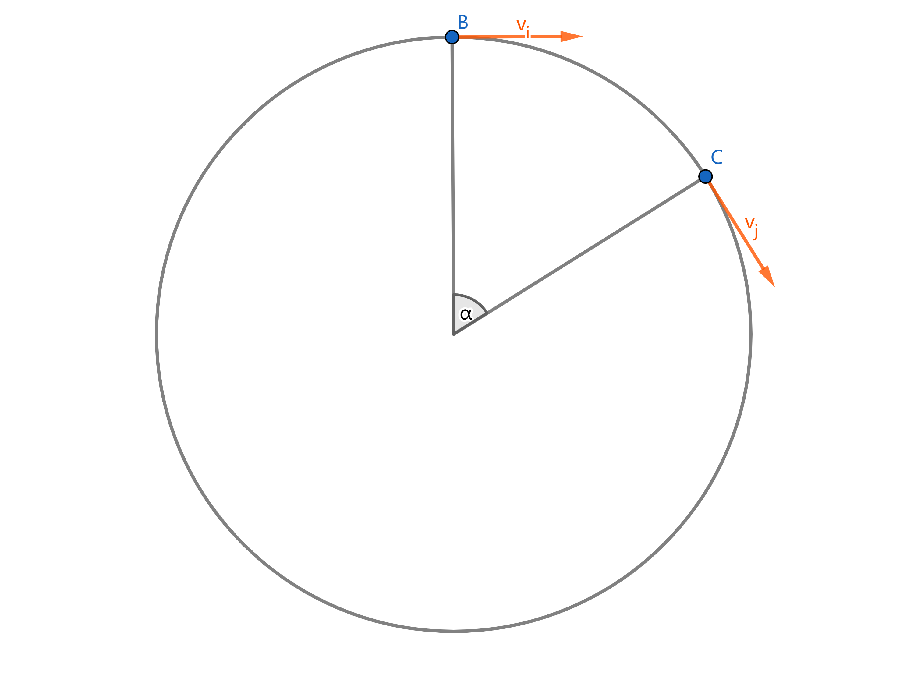 考虑一个物体在圆周上运动。我们记圆周运动的半径为$r$,线速率为$v$,角速度为$\omega$,$0$和$t$时刻的线速度为$\vec{v_{i}}$和$\vec{v_{j}}$,经过的角度为$\alpha$,易知$\lvert \vec{v_{i}} \rvert = \lvert \vec{v_{j}} \rvert = v$,且都与圆相切。
