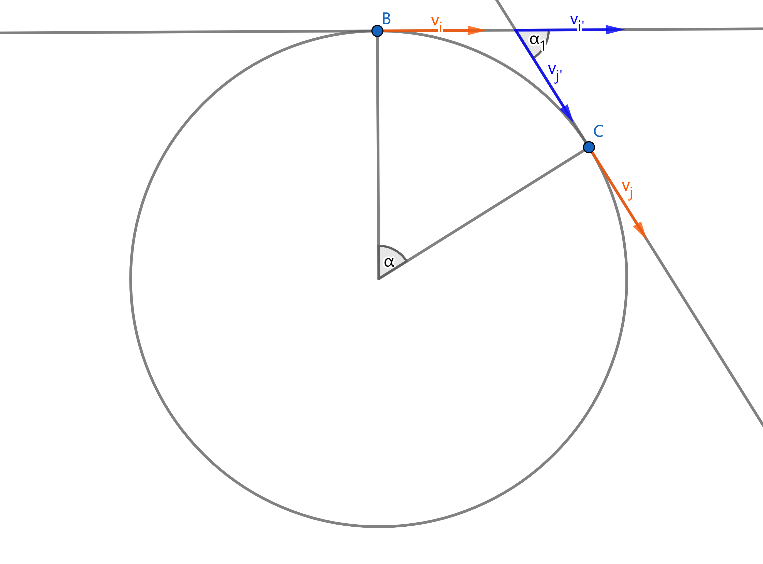 可以看到在式子中我们要将两个向量相减。我们可以通过平移把两个向量尾尾相接便于计算。由切线的性质,可以发现平移后的$\vec{v_{i}’}$和$\vec{v_{j}’}$夹角$\alpha_{1}=\alpha$。
