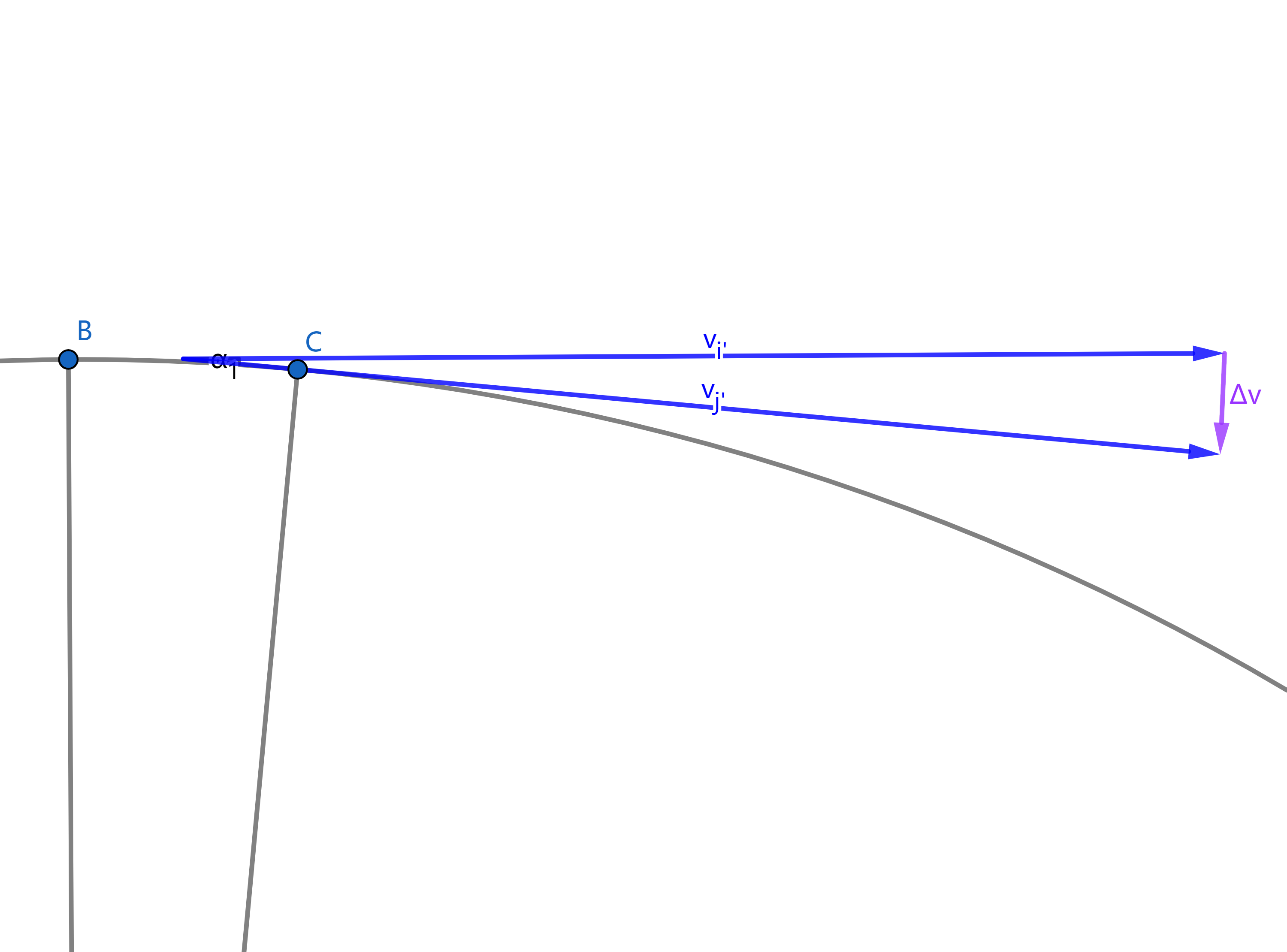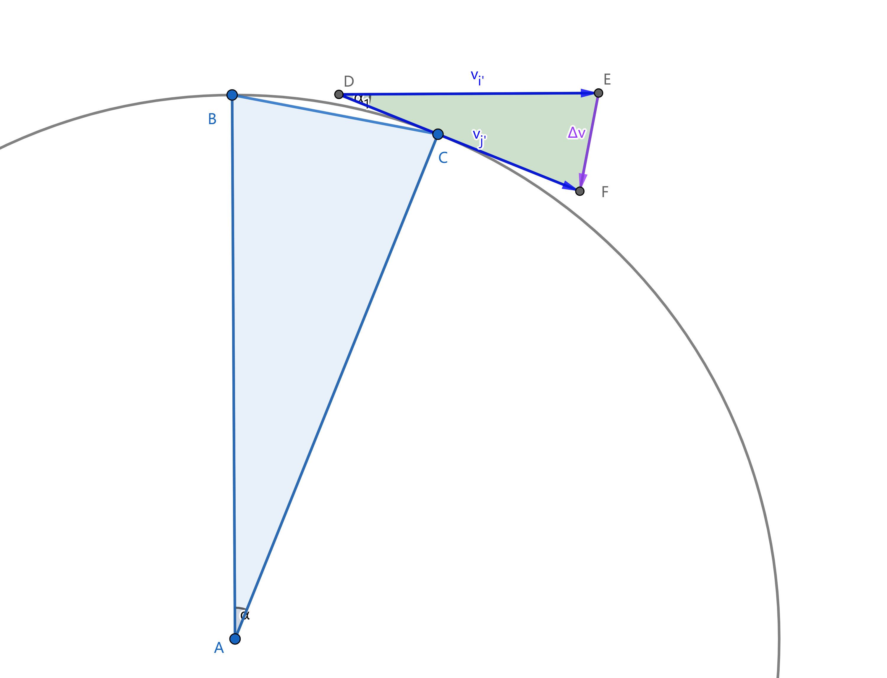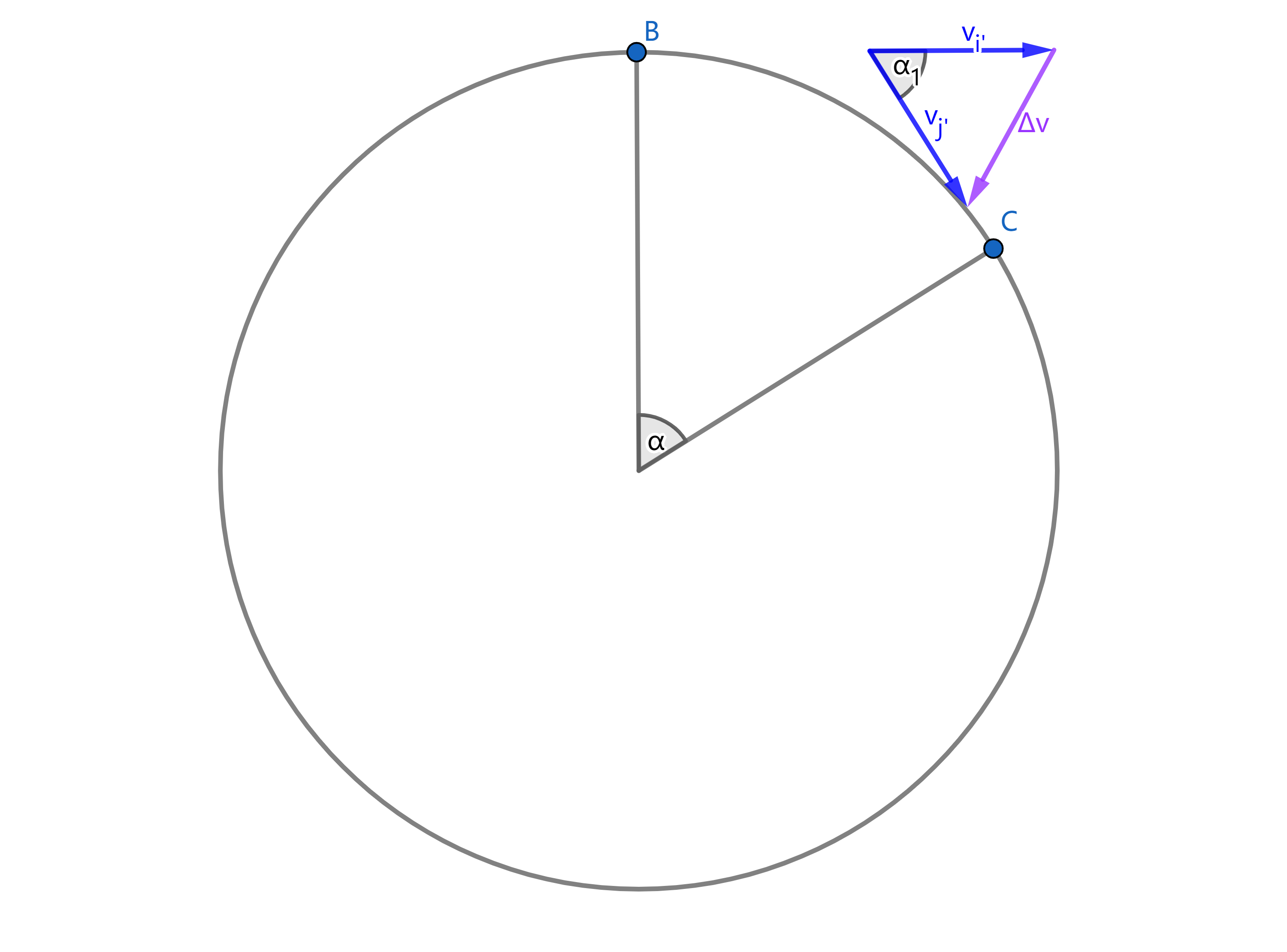 \[\frac {\lvert \overrightarrow{\triangle v} \rvert} {\lvert \vec{v_{i}'} \rvert} = \frac {BC} {AB} = \frac {BC} {r}\]由于我们在求解瞬时加速度,$t\rightarrow 0$时$\alpha \rightarrow 0$,$BC \rightarrow \overset{\LARGE\frown}{BC}$,所以